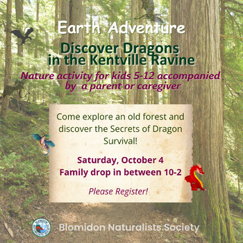 Come for 10 am, 11 am, noon or 1 pm. Activities take approximately 1.5 hours in small groups and are led by Blomidon Naturalists' staff (with support from caregivers). To register for this event and for a detailed write up of the activities we will be doing, please visit https://earthadventures.ca/trail/kentville-ravine/