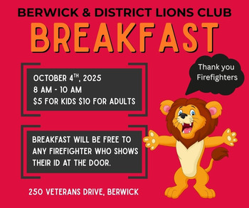 Brewick & District Lions Club Breakfast is honoured to offer all firefighter a FREE Breakfast with proof of ID.