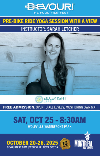 Greet the day, embrace wellness, and join our vibrant community at an energizing early morning yoga session by the ocean! Perfect for all ages and fitness levels, this rejuvenating experience will be held under our cozy tents at Wolfville’s Waterfront Park. Don’t miss out on this chance to stretch, breathe, and strengthen your body before Le Tour de l’Acadie Bike Ride. Weather location: inside Devour! Studios.