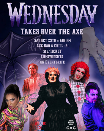 Come join us at The Axe Bar & Grill for a night of creepy entertainment at this chilling Drag Show event! Get ready to be dazzled by eerie performances, amazing costumes, and ghostly talent. Whether you're a seasoned drag aficionado or new to the scene, this event promises to be a night to remember. Grab your friends and come on down to The Axe Bar & Grill for a Takeover like no other!