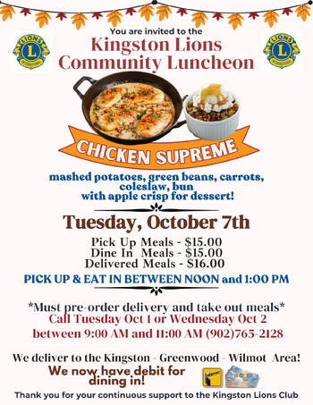 The Kingston Lions Noon Luncheon this month is Chicken Supreme and Apple Crisp for dessert.