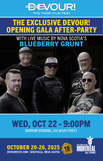 Get ready for an unforgettable night at Devour! Studios as we kick off the 15th edition of Devour! The Food Film Fest with our special guests, delegates, and sponsors. Featuring a rare musical appearance by Nova Scotia’s Blueberry Grunt. Enjoy mingling, exclusive signature cocktails, and a delicious array of authentic Nova Scotian delicacies. It’s a party you won’t want to miss!