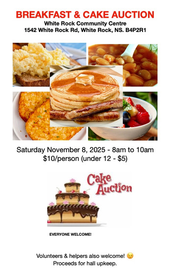 Come for the Breakfast. Stay for the Cake Auction! Big breakfast - great food. Pancakes, scrambled eggs, sausage, toast, baked beans, fruit, coffee, tea, juice.