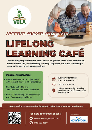 Lifelong Learning Cafe is a weekly event aimed at older adults. It consists of educational/recreational topics and speakers as well as just simple social afternoons.