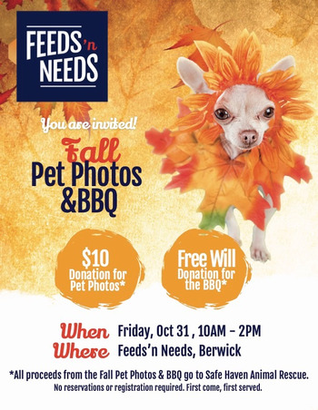Bring your pet (any kind) to Feeds ‘n Needs, Berwick. We’ll take your pet’s photo against a seasonal backdrop. Costumes are welcome, but not mandatory. Photos will be emailed to the owner. All proceeds to Safe Haven Animal Rescue.