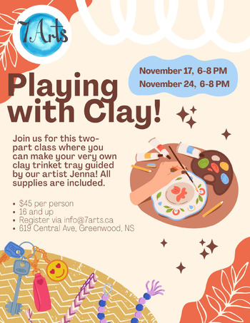Come to 7Arts and create your own clay trinket trays with Artist Jenna! This is a 2-part class with the second part on November 24 (6-8pm). For ages 16+. Register by email. Space is limited!