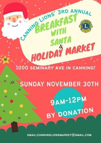Please join the Canning Lions Club for our 3rd annual Breakfast with Santa and Holiday Market! Wonderful variety of local vendors, full breakfast with all the fixins', Vendor Ticket Auction and 50/50 raffle, children's activities… and a Holly Jolly visitor!