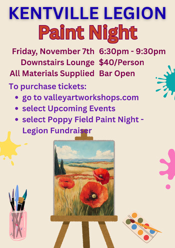 As a fundraiser for Br 006, we are very pleased that Isobel of Valley Art Workshops will hold another paint night at our location. NO EXPERIENCE NECESSARY! We will be painting that beautiful field of poppies. Isobel will lead us through step by step.