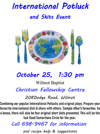 Combining our popular International Potlucks and four new original skits. Prepare your favourite international dish & share with others. Sample other’s favourites. As a bonus, there will also be four original short skits presented. This will be the last Good Samaritans Circle for the year. Call for information and recipe help & suggestions.