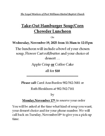 Choice of Corn Chowder or Hamburger Soup, Flower Cart Roll and Butter, Apple Crisp or Coffee Cake.