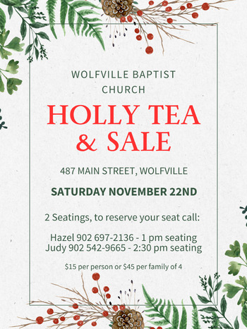 Holly Tea & Sale. Delectable sandwiches & sweets. Gluten-free options available. Two seatings available. Call to reserve: 1pm - Hazel, 902.697.2136 or 2:30pm - Judy, 902.542.9665. Baked goods and pre-loved treasures for sale.