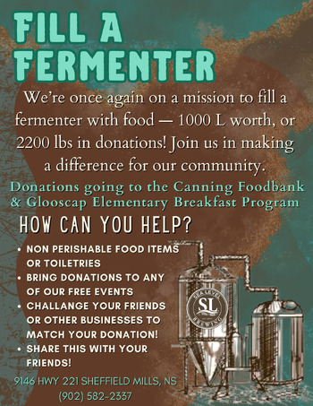 Our 'Fill a Fermeneter' Food Drive last year was such a huge success, we are doing it again! We are accepting both cash and food donations for the entire month of November for the Glooscap Elementary Breakfast Program and the Canning District Food Bank. Help us stock the shelves!