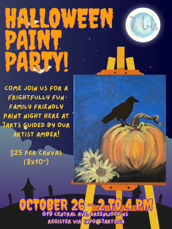 Join us for a frightfully fun, family friendly paint party at 7Arts! Artist Amber will guide participants through this delightful crow on a pumpkin painting. Great for all ages and experience levels. Registration is required by email. When registering, please let us know how many canvases you'd like.