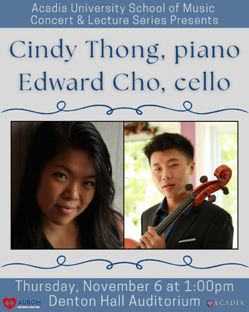 The Acadia School of Music’s Concert & Lecture Series presents a recital by pianist Cindy Thong and cellist Edward Cho, featuring Beethoven’s 4th Cello Sonata, Debussy’s Cello Sonata and Barber’s Cello Sonata.