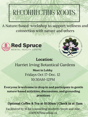 The Red Spruce Mental Health Centre is offering nature-based workshops in support of wellness and connection with nature and others weekly at the Harriet Irving Botanical Gardens this fall. Sessions facilitated by Acadia University Masters of Education Counselling Students Allie and Stephanie. All are welcome. Drop-in sessions Fridays from Oct 17 - Dec 12.