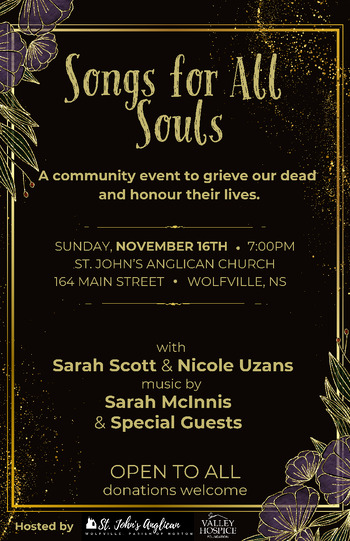A gathering to remember our dead, honour their lives.and celebrate with songs and reflection. Songs for All Souls creates space to hold all our griefs, however recent or ancient, because we all carry experiences of love & loss. All persons are welcome to attend, no matter your faith background. Hosted by Valley Hospice Foundation and St. John’s Anglican Church, Wolfville.