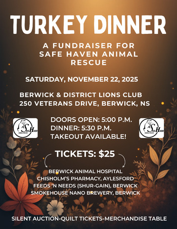 Turkey Dinner: Fundraiser for Safe Haven Animal Rescue. Also, silent auction, quilt tickets, merchandise table. Dinner at 5:30.