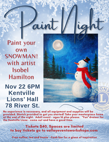 Let’s get Christmas started early – why not! And let’s do it for a good cause. This event is a fundraiser for the Kentville Lions Club. We’ll be using their large hall space for a paint night event, and painting this fun snowman!