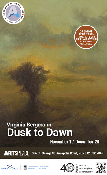 An exhibition of oil paintings by Virginia Bergmann of poetic, moody landscapes featuring the atmospheric effect on the landscape of low light times of day, dusk and dawn and in between.