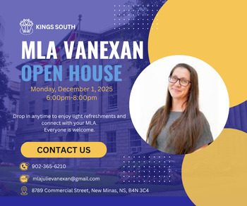 Join us for an evening of community connection and conversation. Drop in anytime to enjoy light refreshments and meet your MLA for Kings South, Julie Vanexan, in a relaxed, welcoming setting.