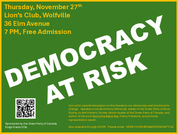 Join us for a panel discussion on the threats to our democracy today, and how we can make positive change. Speakers are Jo-Ann Roberts, past interim leader of the Green Party of Canada and author of the book Storm the Ballot Box: An Insider's Guide to a Vote Revolution; Anthony Edmonds, leader of the Green Party of Nova Scotia; and Henry Hoeksma, software design professional and founder of Heart and Head voting systems.