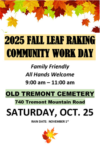 Join us for a Community Volunteer Work Day to rake the fall leaves. This is a family friendly, all hands welcome event. Extra rakes are available or bring your own.