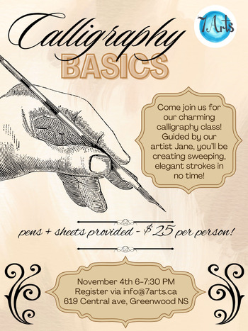 Have you ever wanted to learn calligraphy? Now's your chance! In this introductory class with artist Jane Beals, participants will learn calligraphy basics and centering a written piece of poetry. No experience necessary; however, it will help if you know how to write cursive. Pens and writing sheets are provided. Space is limited. Registration is required by email.