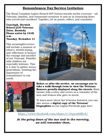 The Royal Canadian Legion Branch 069 Ortona warmly invites everyone ~ all Veterans, families, and community members to join us in honouring those who served and sacrificed. Together, let us pause, reflect, and remember.