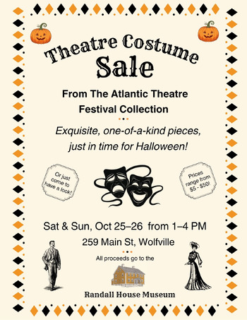 Explore beautifully crafted theatrical costumes originally made for the Atlantic Theatre Festival in Wolfville (1995-2007) — handmade pieces of stage history! Come to buy or just to have a look ?