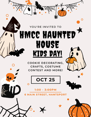 Come check out HMCC haunted House Kids day at the Hantsport Memorial Community Centre. Cookie decorating, crafts and walk through the Haunted House.