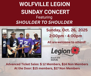 Wolfville Legion's Sunday Afternoon Monthly Concert Series features Shoulder to Shoulder (a Mark Riley Band). All are welcome to attend.
