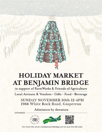 Celebrate the magic of the season in the Gaspereau Valley! Join us for our annual Holiday Market at Benjamin Bridge, a festive afternoon supporting FarmWorks and Friends of Agriculture.