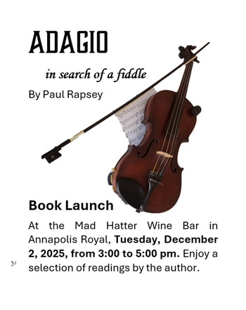 Paul Rapsey's "Adagio" is the moving story of a fiddle over seven generations of the sometimes tumultuous lives of one Cape Breton family. It starts with a shipwreck on a stormy night in 1885 and travels through 140 years to the present. It is the story of struggle, sorrow and an awakening. It is a tale of heartbreak, resolution and forgiveness. Paul will read selections from the book.