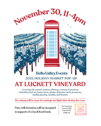 Hello.Valley.Events Holiday Pop-up Market. Featuring 28 curated vendors offering a variety of products, including food, art, home decor, plants, skincare, cards, preserves, textiles, jewelry, candles, and flowers.