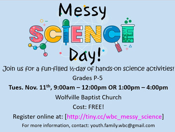 Join us on Tue Nov 11th for a fun-filled 1/2 day of hands-on science activities. Morning 9-12 or Afternoon 1-4. Grades P-5. Grades 6-12 are welcome to register as helpers. Cost: Free.