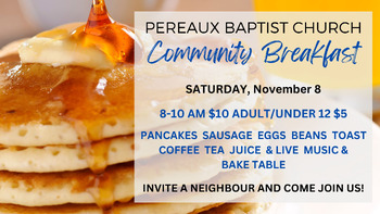 Come and warm up to the weekend with a delicious breakfast and the company of friends. Sausage, baked beans, scrambled eggs, pancakes, tea, coffee, and juice are included. Live music and a bake table full of delicious goodies to take home!