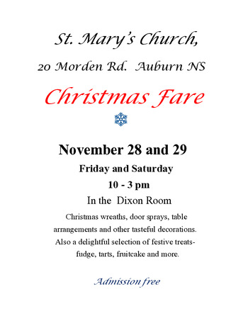 Handmade evergreen wreaths, door sprays, fruitcake, fudge, tarts and cookies.