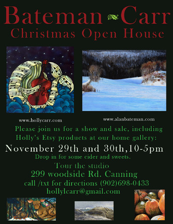 Bateman Carr Annual Christmas open house. Visit the gallery and studios of Alan Bateman and Holly Carr. Alan and Holly will be showing their latest work and demonstrating their painting process. Treats and Cider provided. This is a very causal event, just drop in and wander around. All are welcome!
