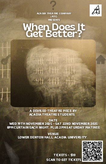 In a time when media superpowers and the social internet profit from fear and division, When Does it Get Better (a piece collectively created by theatre students from first year to fourth year – and beyond) grapples with despair and searches for hope. It explores themes of death, loss, self-harm, abortion, disability, and chronic illness with honesty, vulnerability, and humour.