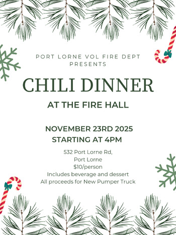 Support the acquisition of our new pumper by enjoying a delightful chili dinner with all the trimmings, including beverage and dessert.