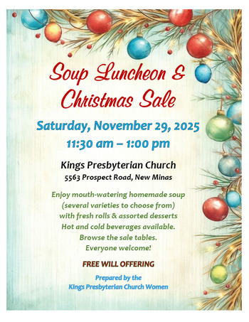 Come enjoy homemade soups and assorted desserts and browse the sale tables. Everyone welcome!