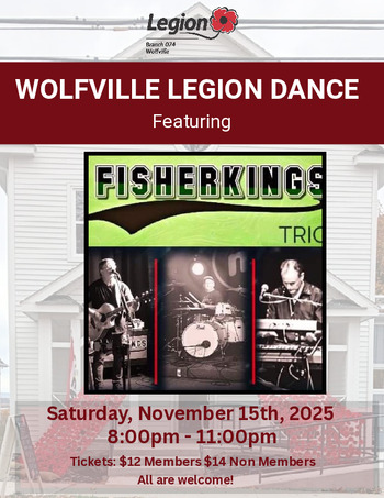 Wolfville Legion's Saturday Night Dance this week features Fisherkings. Last dance before New Years Eve so come out and enjoy the comfortable seating, great view and tunes