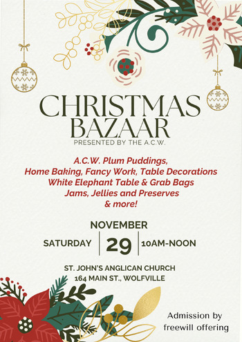 The Annual Christmas Bazaar offering jams & jellies, home baking, table decorations, 'white elephant' table and plum puddings!