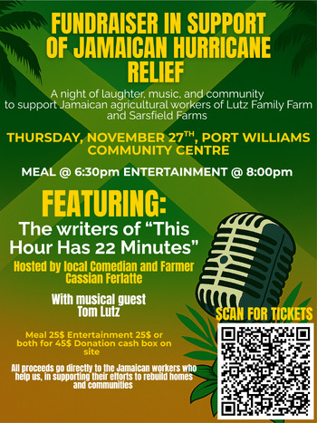 Join us for an evening of food, music, and a comedy show by the writers of "This Hour Has 22 Minutes" to support those affected by hurricane Melissa in Jamaica. Let's come together to make a difference and show our solidarity with the Jamaican agricultural community that allow us to farm in Nova Scotia, and contribute so positively to all of our communities. Your contribution can help rebuild homes and communities. Together, we can make a meaningful impact.