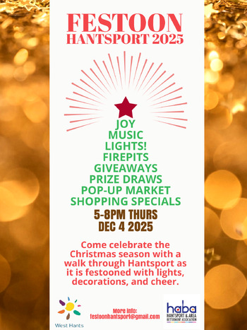 Come celebrate the start of the Christmas season with a walk thru Hantsport as it is festooned with lights, decorations, and cheer. The shops will be open, there will be fire pits to warm by likely at HMCC, by Home Hardware, by Avon United Church, at the Fire Hall, and perhaps Chittick Park.