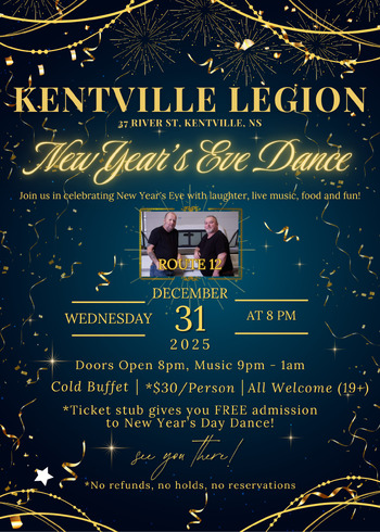 Come party and ring in the New Year with us at the Kentville Legion's New Year's Eve Dance!! Come join us for live music, good food and good times! ALL WELCOME (19+).