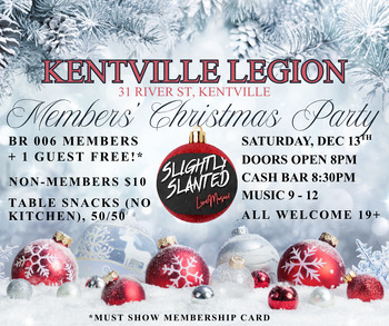 We call it Members' Christmas Dance because for Br 006 Members + 1 Guest it's FREE but everyone (19+) is welcome to join us for our Christmas Dance with live music provided by Slightly Slanted. Cash bar 8:30pm. The kitchen will be closed so our Volunteers can participate in the festivities but snacks will be provided for each table.