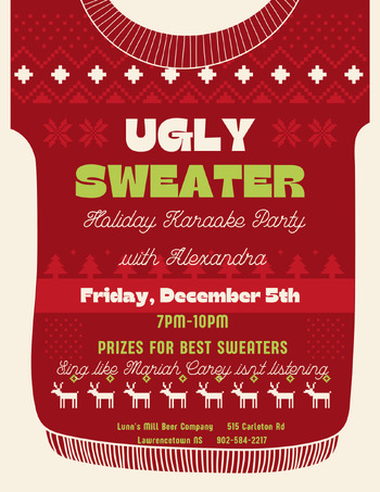 We are celebrating our 9th Ugly Sweater Christmas Party with host Alexandra Dawn Rogerson will have the mic ready for you to sing your favourite holiday tunes...or your song you've practiced in the shower for the last month
