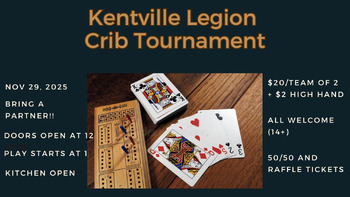 Attention all Crib Players! Kentville Legion's November Monthly Crib Tournament.Teams of 2 must register before play starts so please arrive earlier than 1pm to allow time to register.