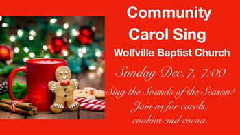 Community Carol Sing. Sing the sounds of the season! Join us for carols, cookies and cocoa.
